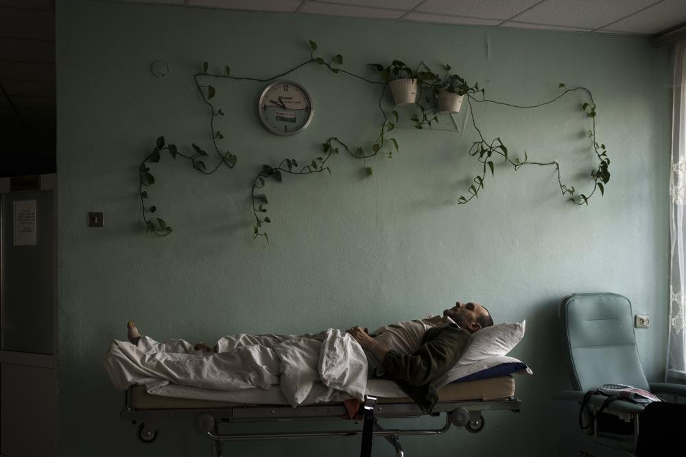 A man injured in a bombing lies on a stretcher at a hospital hallway during an air raid alarm in Brovary, north of Kyiv, Ukraine, Thursday, March 17, 2022. (AP Photo/Felipe Dana)